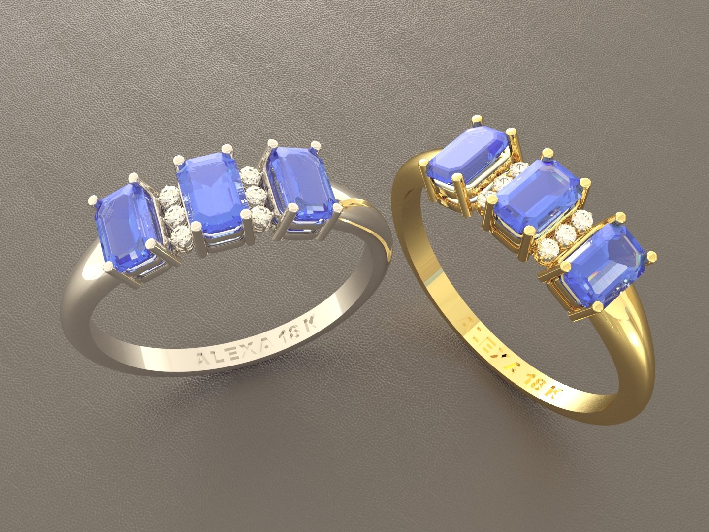 Anillo de oro 18 k. blanco o amarillo. peso aprox. 2.8 grs. lleva tres ( 3 ) agua marina naturales rectangulares de 5×3 mm c/u. mas seis ( 6 ) diamantes naturales de 1.2 mm c/u = 0.06 crt. total. ( S I / COLOR GH ).